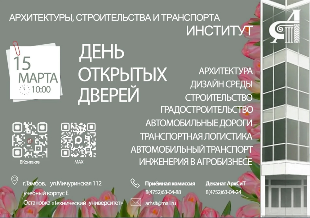 Сообщаем, что 15 марта в 10:00 состоится День открытых дверей Института архитектуры, строительства и транспорта!